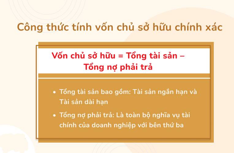 Vốn chủ sở hữu = Tổng tài sản – Tổng nợ phải trả
